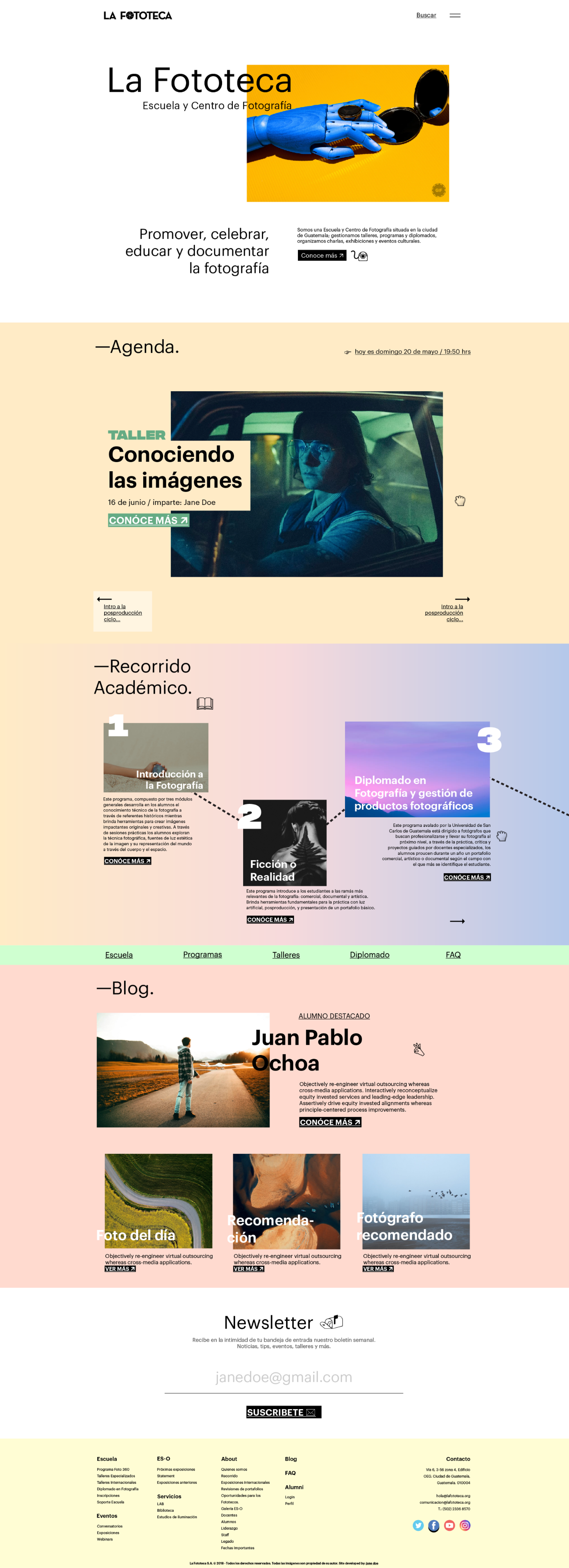 La Fototeca, during 2018, was developing different branches into their business model such as: education, gallery, events, cultural spaces, professional printing services, and more. Therefore, they needed to reflect such information into their website in a much more organized way. Also, La Fototeca was looking forward to refresh their website look and feel into something modern.